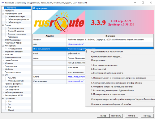 После перезагрузки следует сгенерировать первоначальные правила фаервола, и включить его в Настройках. Если сеть не заблокирована, то первоначальная настройка успешна, следует перейти на вкладку "О программе" и ввести регистрационные данные (имя пользователя, адрес e-mail пользователя, серийный номер программы), после чего в контекстном меню списка, содержащего регистрационную информацию (вызываемом по нажатию правой кнопки мыши) выбрать пункт "Проверить ключ и сгенерировать запрос на активацию". Если ключ введён правильно, то в списке отобразится сообщение "Ключ верен". После этого можно скопировать запрос на активацию в буфер обмена и отправить его по электронной почте на адрес службы поддержки support@rusroute.ru или осуществить запрос на активацию позже.