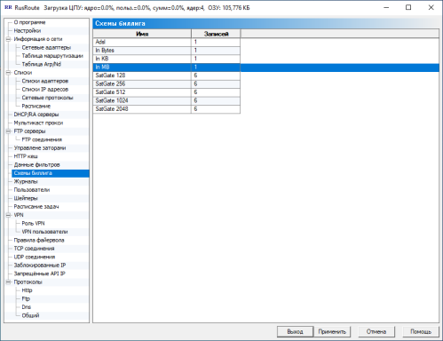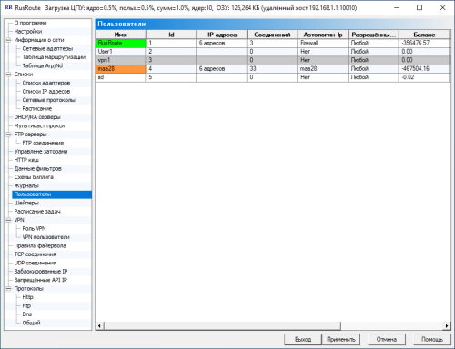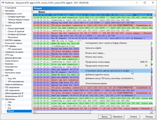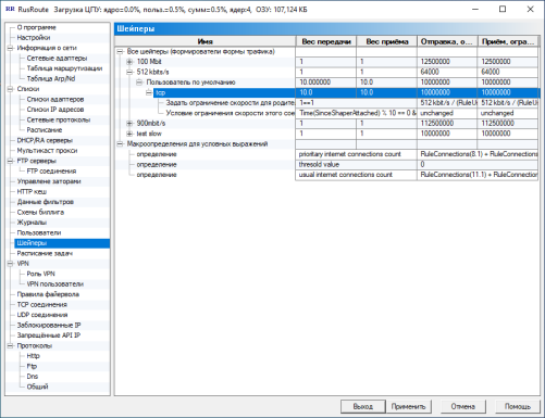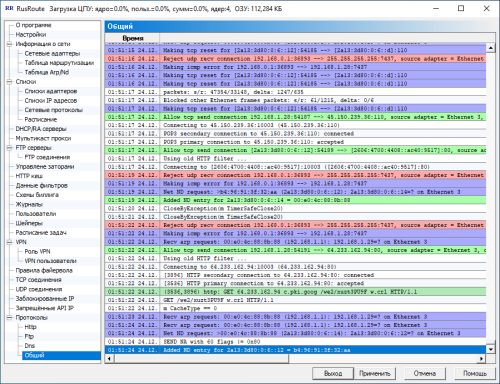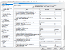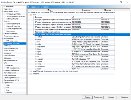 В этом окне вы видите глобальные настройки программы, такие, как приоритет процесса, TCP оптимизация на уровне ядра, анти TCP флуд и анти SYN DDoS защит, алгоритм TCP предотвращения заторов по умолчанию (экспериментально, не используется), настройки Anti-SYN флуда, опции шейперов (не используются), блокировки сканирования TCP портов / анти флуд, специфические настройки VPN клиента, также другие настройки. В этом окне также отображается, как и в заголовке, количество используемой памяти процесса службы RusRoute фаервол.