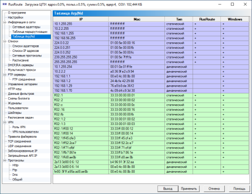 В данном окне отображается таблица Arp (Address resolution protocol для IPv4) или, ещё она называется таблица MAC адресов, и ND (Neighbor Discovery для IPv6). В ней видны динамические и статические записи, сопоставляющие IP адресам MAC адреса сетевых карт. RusRoute ведёт свою собственную таблицу Arp/ND, совмещая её с таблицей Arp/ND Windows. Соответственно, в последних двух колонках списка в данном окне вы видите, находится запись в таблице RusRoute и/или Windows.