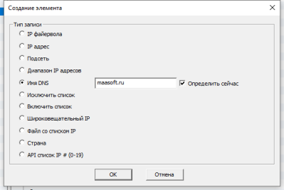"Имя DNS" - доменное имя хоста, например, "maasoft.ru". Файервол работает напрямую с IP адресами, поэтому важно определить по доменному имени IP адрес(а) для работы. Если это не сделать сразу, убрав галочку напротив "Определить сразу", в таком случае определить IP адреса всех доменных имён можно, выбрав соответствующий пункт в контексном меню основного окна.