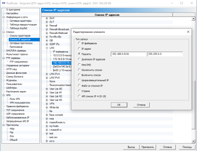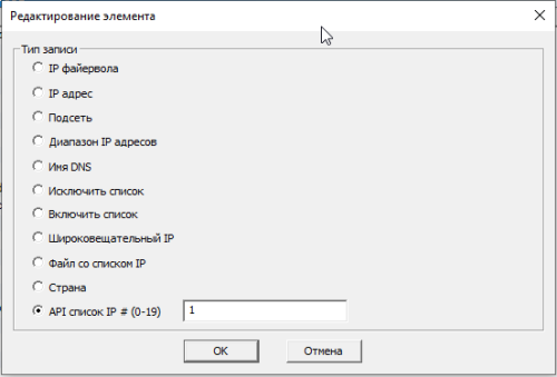Здесь можно создавать и изменять списки IP адресов. Для этого используется правая кнопка мыши на существующих элементах и выпадающее контекстное меню и диалог указания типа и значения элемента. Элементы каждого списка могут быть следующих типов: