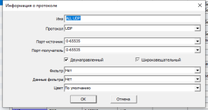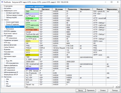 Список сетевых протоколов со следующими критериями: имя, IP протокол, (порт-)источник, (порт-)получатель, двунаправленный/однонаправленный/не направленный (для UDP и PING), фильтр, данные фильтра, широковещательный.