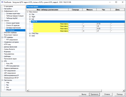 Здесь вы можете задавать списки времени, чтобы в дальнейшем указать их в параметрах правил. Соответствующее правило будет активным при установлении соединения только в указанный промежуток времени, а в другое время правило будет игнорироваться, но уже установленные соединения будут действовать.
