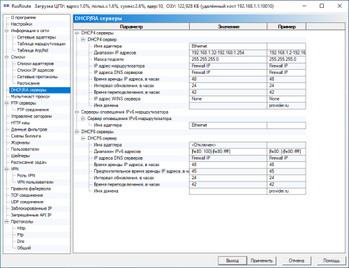 Здесь можно настроить DHCP серверы на каждом адаптере, чтобы не указывать IP адреса и другие сетевые параметры на каждом компьютере локальной сети.