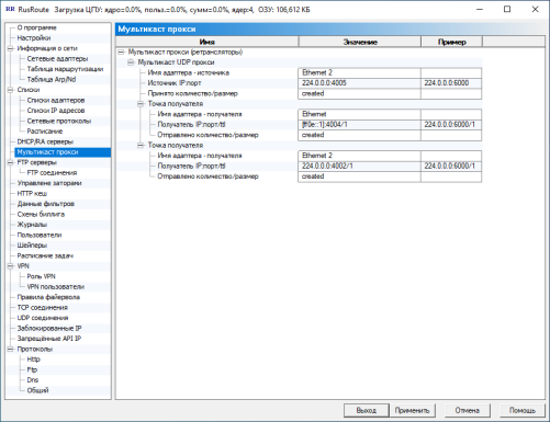 RusRoute фаервол не может маршрутизировать мультикаст трафик, но в нём есть функция мультикаст прокси. В этом окне вы можете задать настройки ретранслятора мультикаст UDP пакетов.