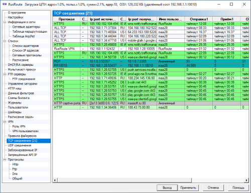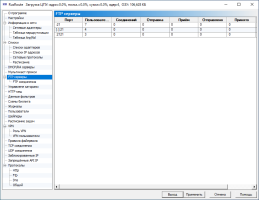 Отображаются TCP соединения с их параметрами, такими, как протокол, адрес, порт, имя пользователя, скорость приёма/передачи на первичном(1) и вторичном(2) уровнях, размер переданных данных и имя правила.