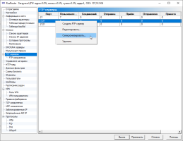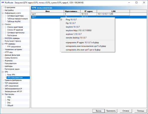 Здесь отображается список всех подключенных VPN пользователей и предлагаются наиболее типичные действия, которые можно с ними совершить, обращаясь по их IP адресам: ping, ftp, просмотр с помощью Internet Explorer'а и explorer'а, просмотр удалённого рабочего стола, копирование IP адреса, имени и DNS имени в буфер. В случае использования фильтра DNS для протокола DNS, к vpn пользователям можно обращаться по их псевдо-DNS имени типа name.vpn - на DNS запрос по такому имени ответить RusRoute сервер, подставив используемый IP адрес.
