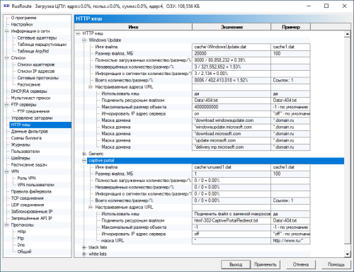 Добавить файлы в фильтры http кеша HTTP кеш | black lists | Настраиваемые адреса URL | Импортировать файлы со списками доменов из выбранного каталога c:\rusroute\blacklists и HTTP кеш | black lists | Настраиваемые адреса URL | Импортировать файлы со списками URL из выбранного каталога c:\rusroute\blacklists