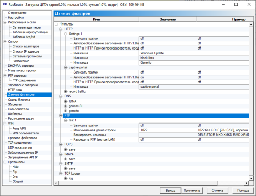Реализованы фильтры протоколов FTP (оба активный и пассивный режимы), IRC, PING, HTTP, PPTP. Для HTTP можно указать параметры фильтра, такие, как кеширование.