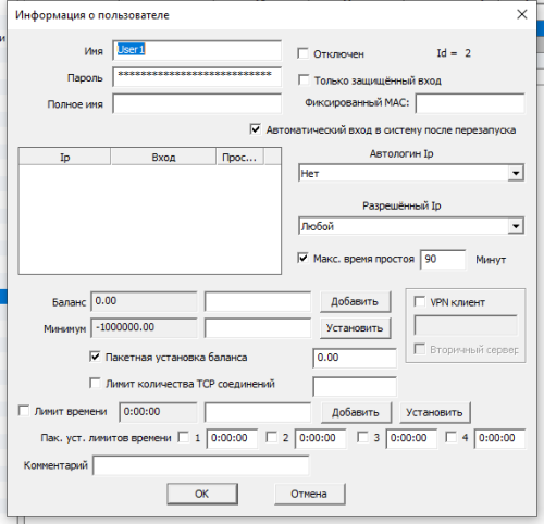 Имя пользователя - укажите имя пользователя для входа в виртуальную защищённую сеть. Только пользователи, у которых в свойствах их учётных записей на первичном VPN сервере разрешена работа в качестве VPN клиента или вторичного сервера, могут входить в VPN сеть.