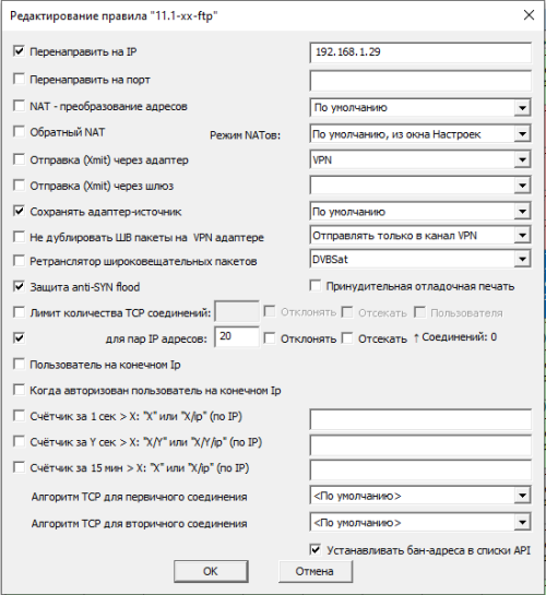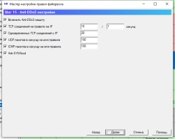 Защита anti-SYN flood - блокировка атакующих входящих пакетов на установку соединений, параметры блокировки задаются в окне Настройки.