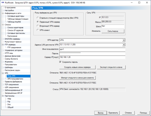 Создать новые ключи сервера - создаются новые ключи (открытый и закрытый) для использования при авторизации пользователей и передачи временного ключа пользователя на сервер. Это нужно сделать как минимумум перед первым запуском первичного VPN сервера. В случае компрометации ключа остановить первичный VPN сервер (перевести его в состояние отдельно стоящего сервера (без VPN)), сгенерировать ключи, запустить снова VPN сервер. Для VPN клиентов генерировать ключи не нужно.