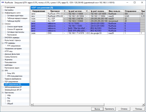 Отображаются соединения динамических правил UDP с их параметрами, такими, как протокол, адрес, порт, имя пользователя, количество пакетов, размер переданных данных и имя правила.