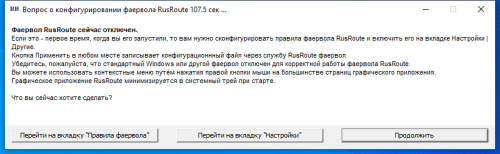 Новое в версии: + Окно о необходимости сконфигурировать и включить отключенный RusRoute фаервол теперь выдаётся не только при старте RRGui, но и при нажатии на кнопку "Применить" (см. скриншот).PS: Некоторые новые пользователи, установив программу, не производят её настройку, отключенный фаервол в таком случае открывает уязвимости в системе. Дополнительный диалог о необходимости выполнить настройку-генерацию правил и включить фаервол побуждает пользователя выполнить необходимые начальные действия. RusRoute фаервол после новой чистой инсталляции находится в отключенном состоянии, чтобы не блокировать трафик до первоначальной настройки для возможности установки его без физического доступа к консоли сервера.
